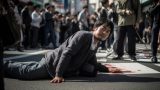 額から血を流す女性、地面に広がる、おびただしい血の量。